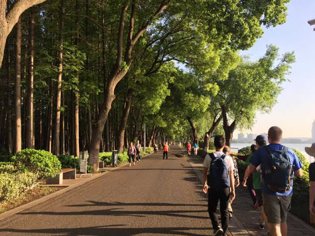 The last leg of the trek was the most trying. Our numbers had shrunk and those who remained were blistered and tired. For the last few miles, some took advantage of Nanjing’s new public-use bike system, and biked alongside walkers. I almost gave up when we came across a conveniently located bus stop, but thanks to the support of classmates and faculty I found the will to go on. For the last mile along Xuanwu Lake, the bikes were left behind and we made our way to the original starting point together on foot.
